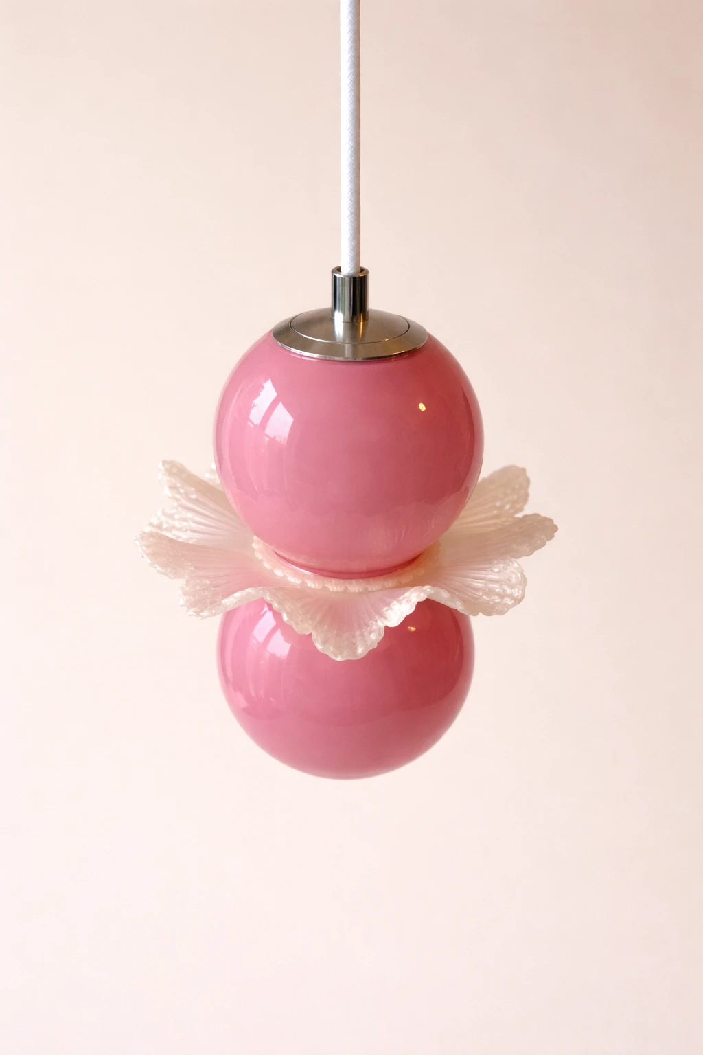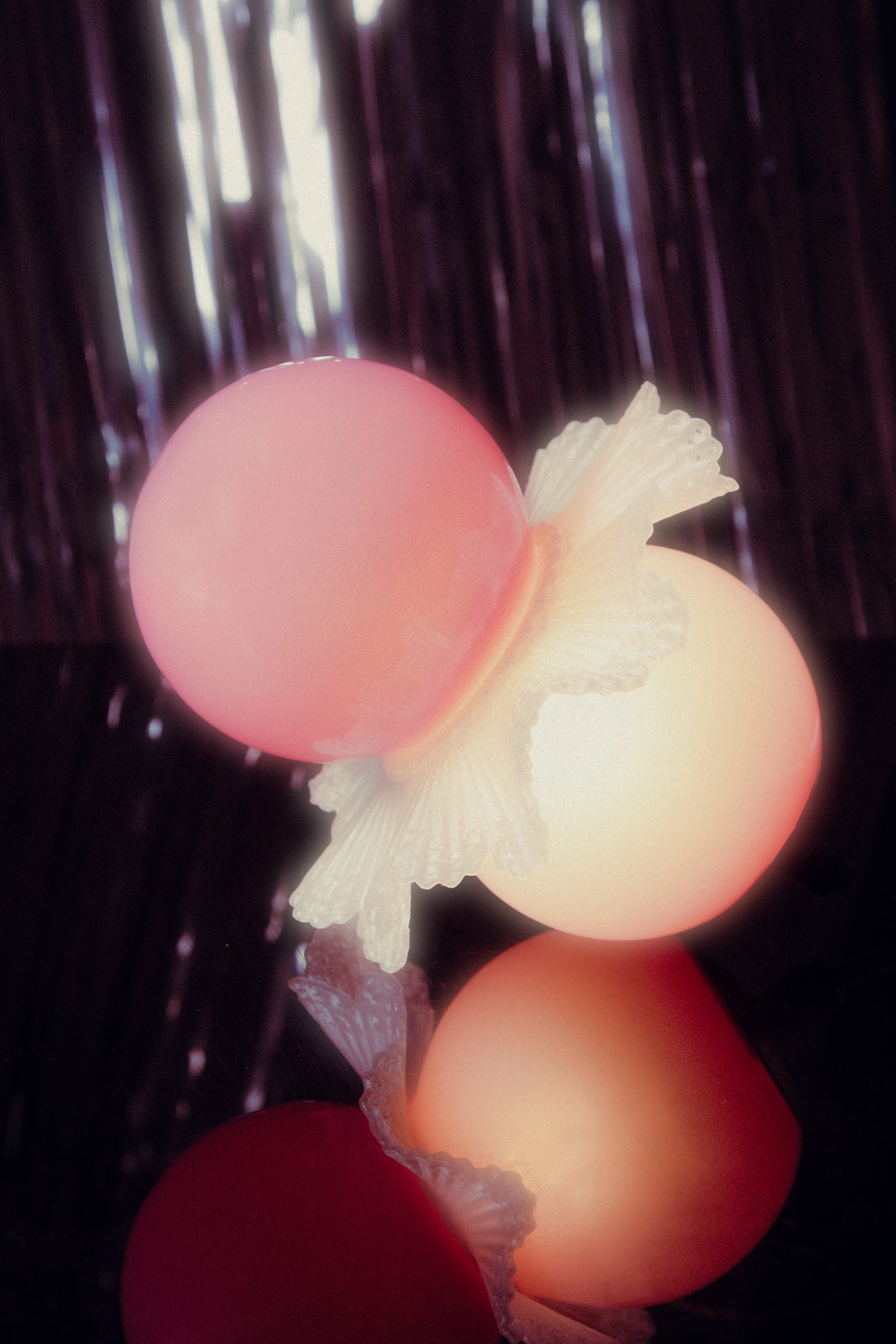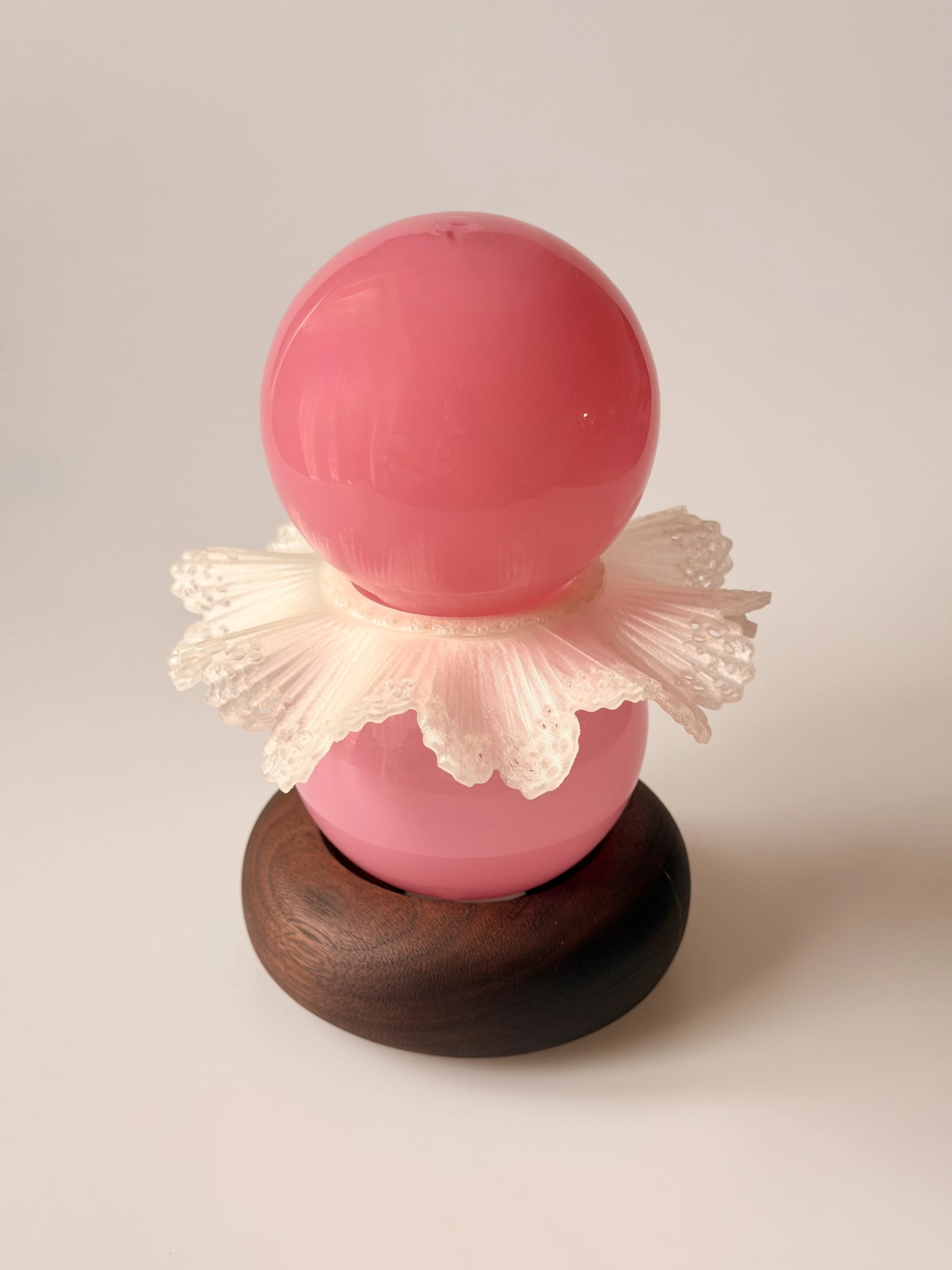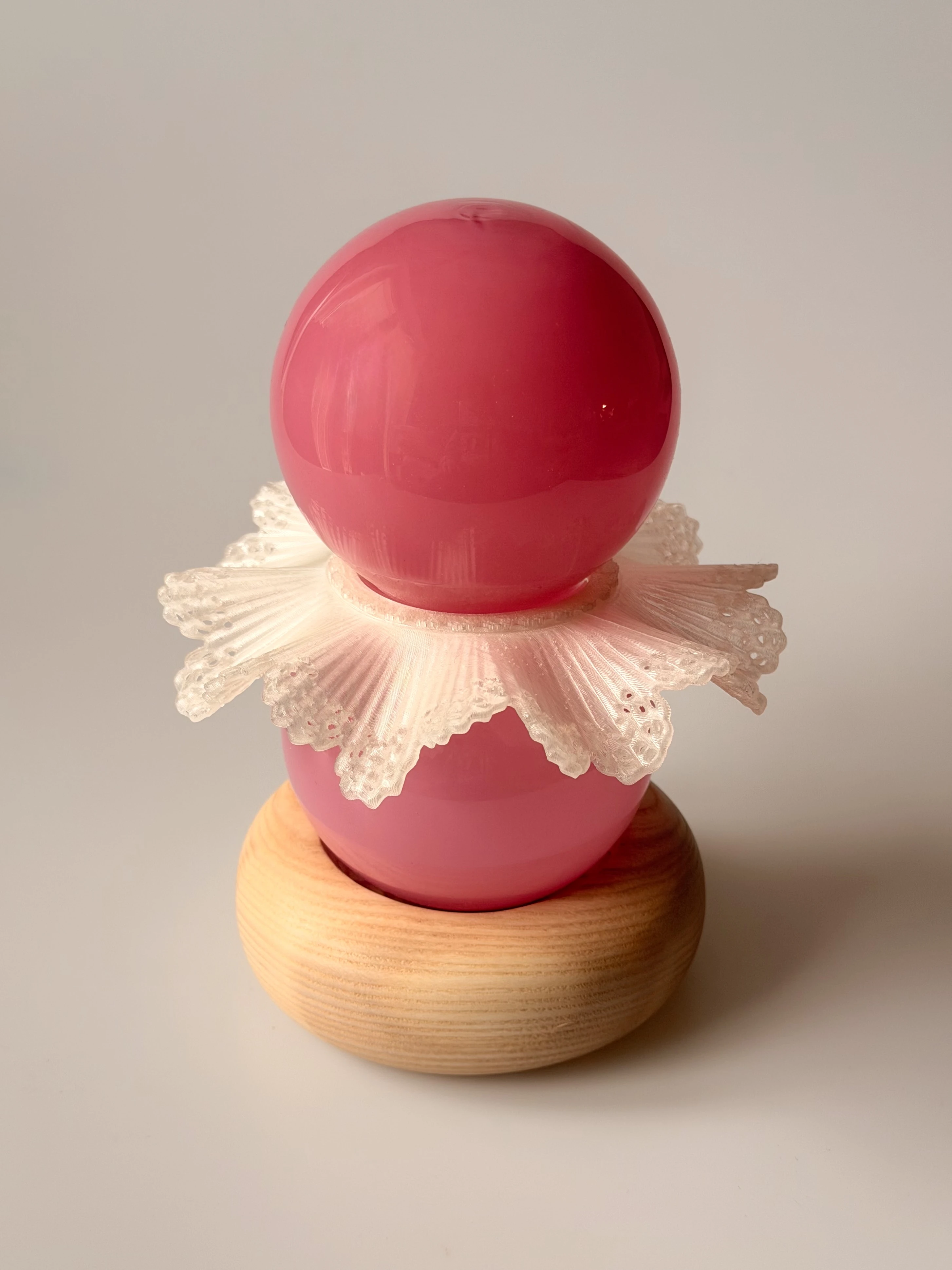 Skontrastowanie pompatycznego, klasycznego rzemiosła ręcznie dmuchanego szkła z nowoczesnym i szczerym drukiem 3D, nawiązuje do akcji opery “Halka” Stanisława Moniuszki. Forma lampki jest poddana antropomorfizacji, dzięki zastosowaniu kulistych kształtów oraz przypominającego kryzę lub halkę falującego detalu.