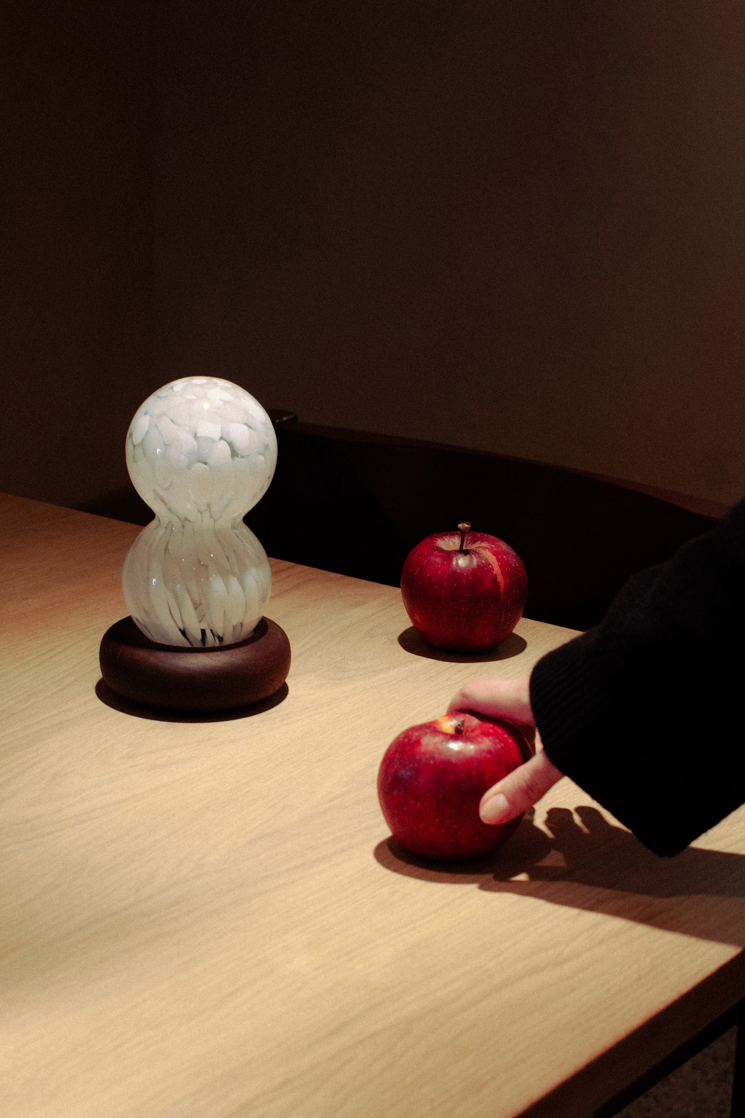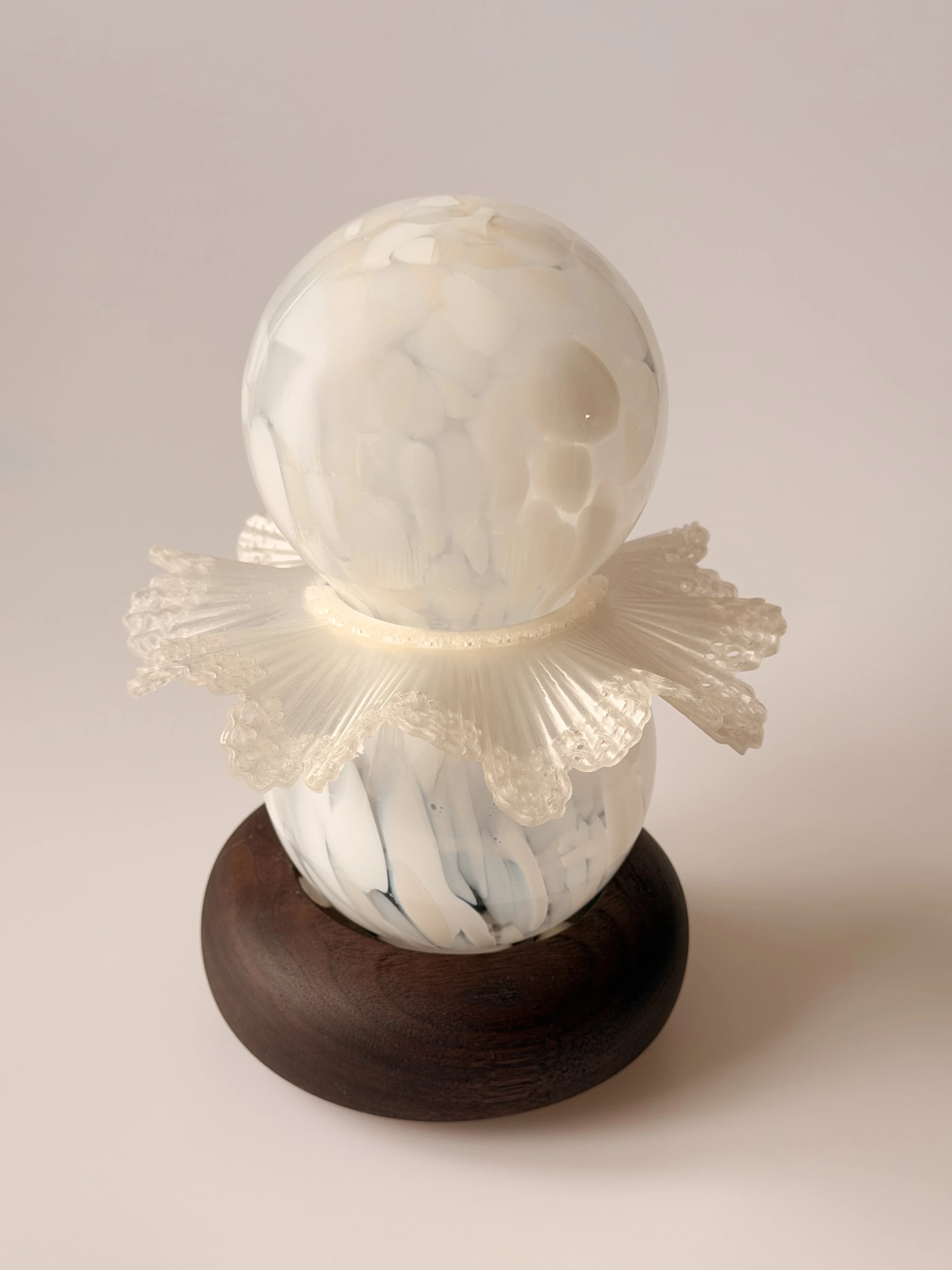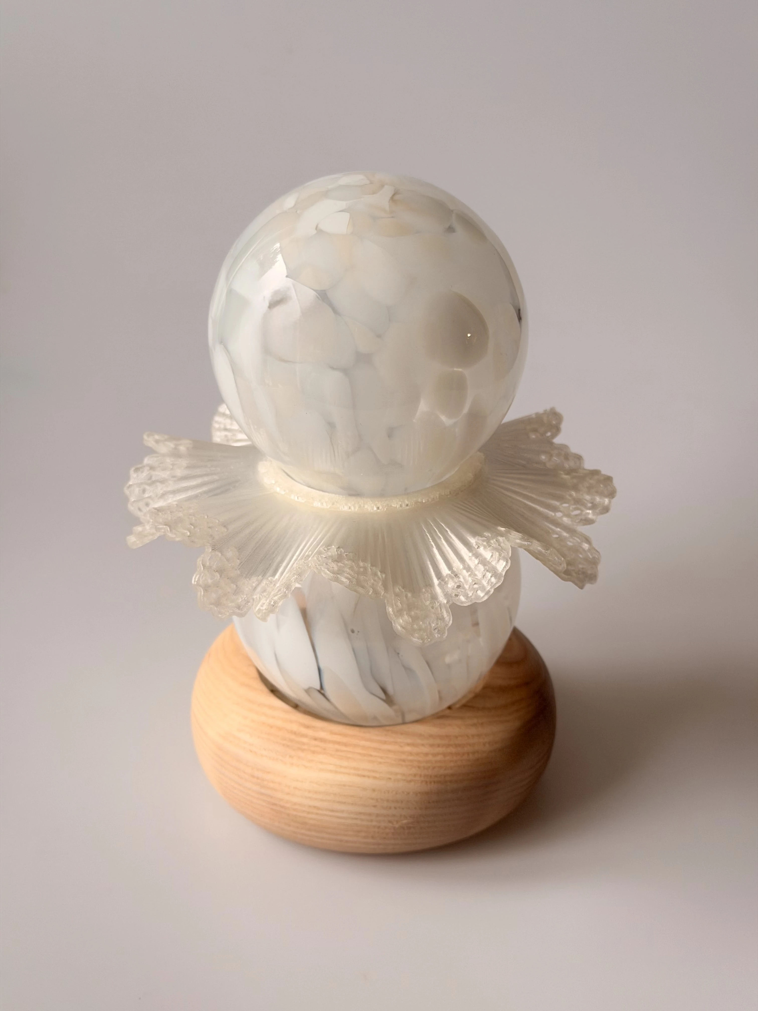 Skontrastowanie pompatycznego, klasycznego rzemiosła ręcznie dmuchanego szkła z nowoczesnym i szczerym drukiem 3D, nawiązuje do akcji opery “Halka” Stanisława Moniuszki. Forma lampki jest poddana antropomorfizacji, dzięki zastosowaniu kulistych kształtów oraz przypominającego kryzę lub halkę falującego detalu.