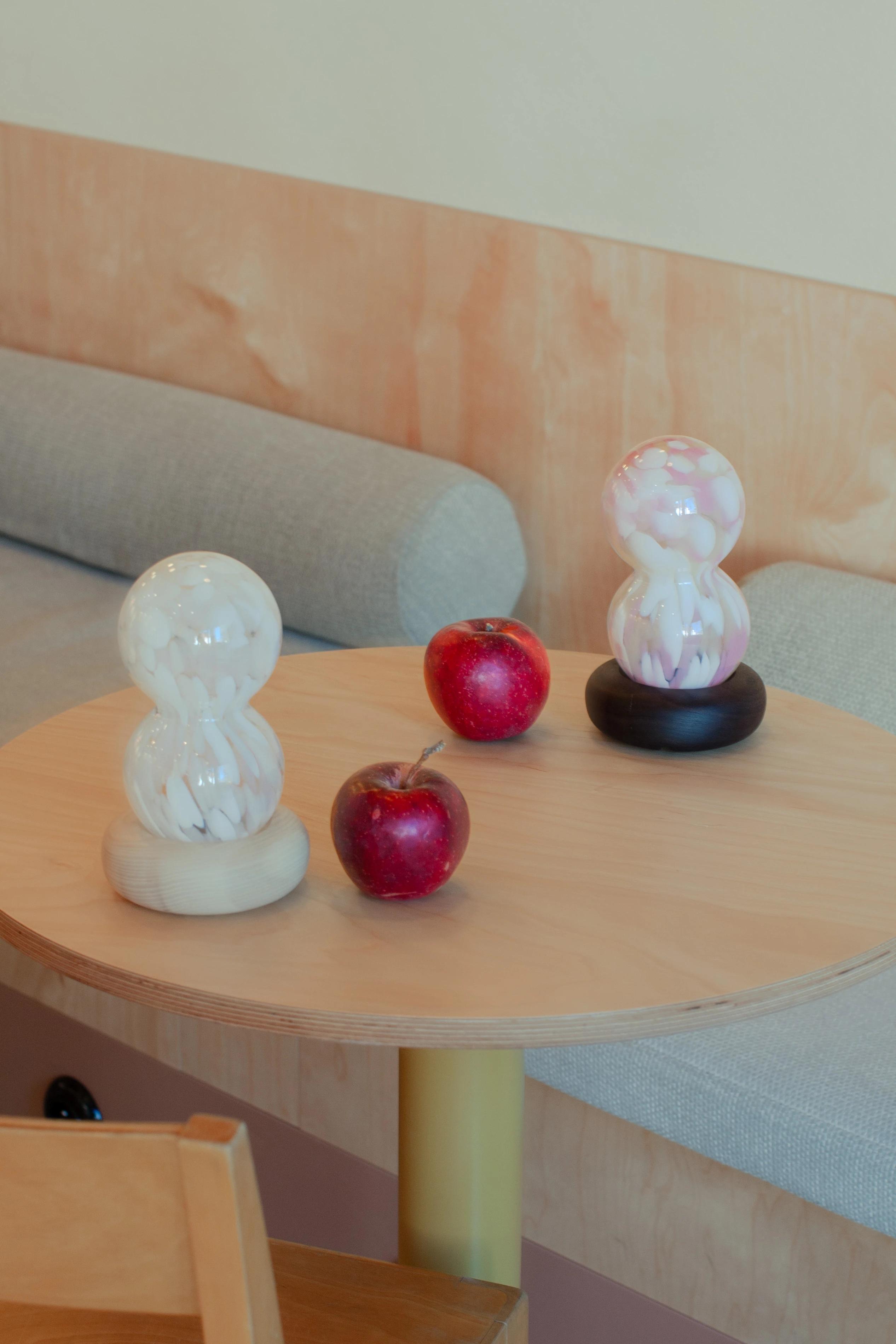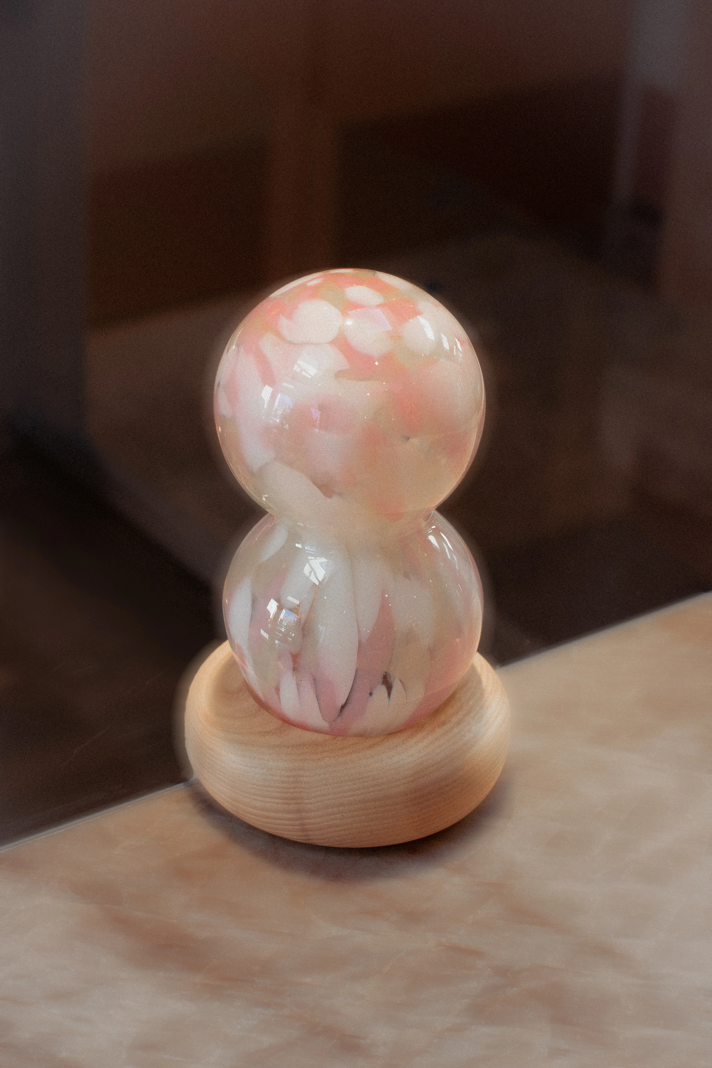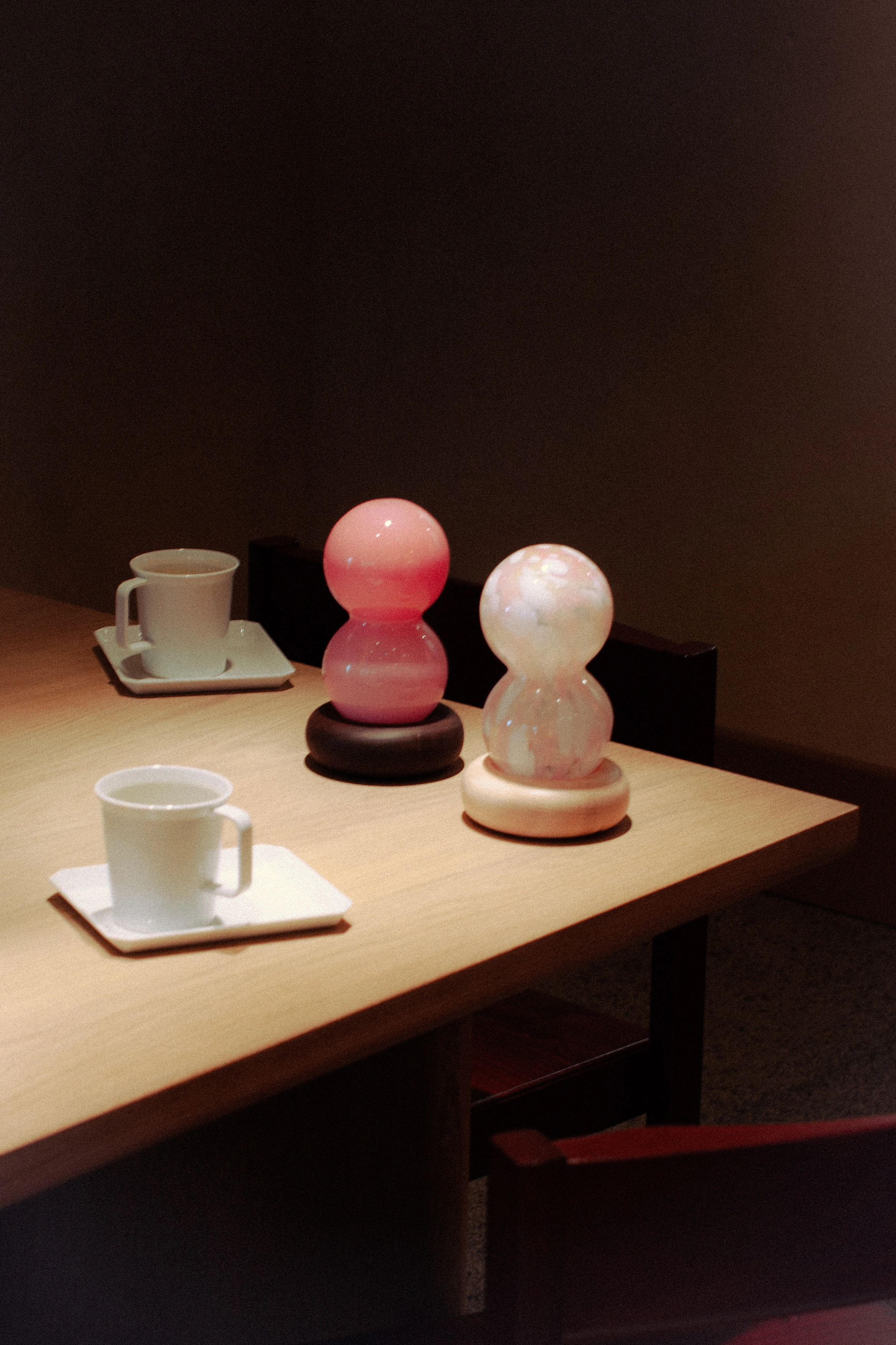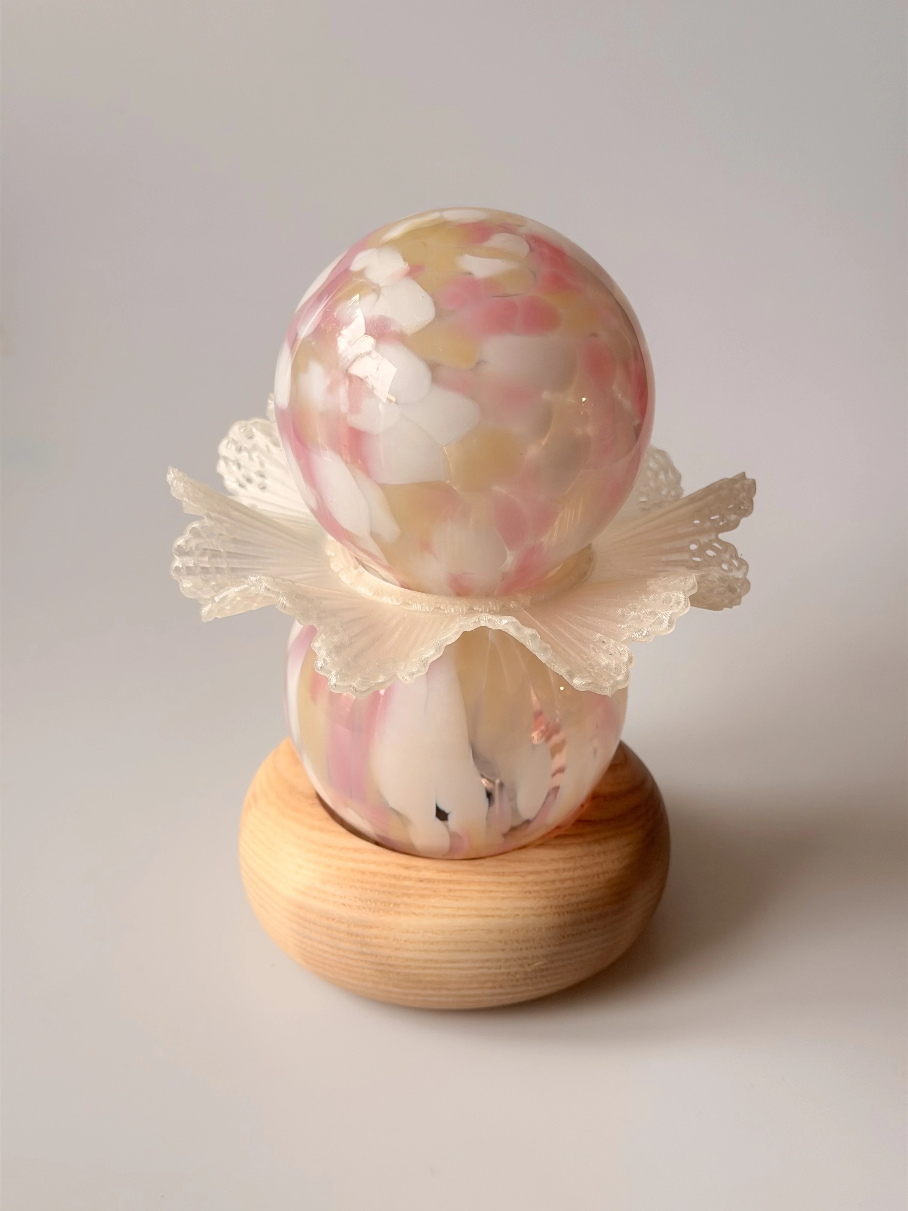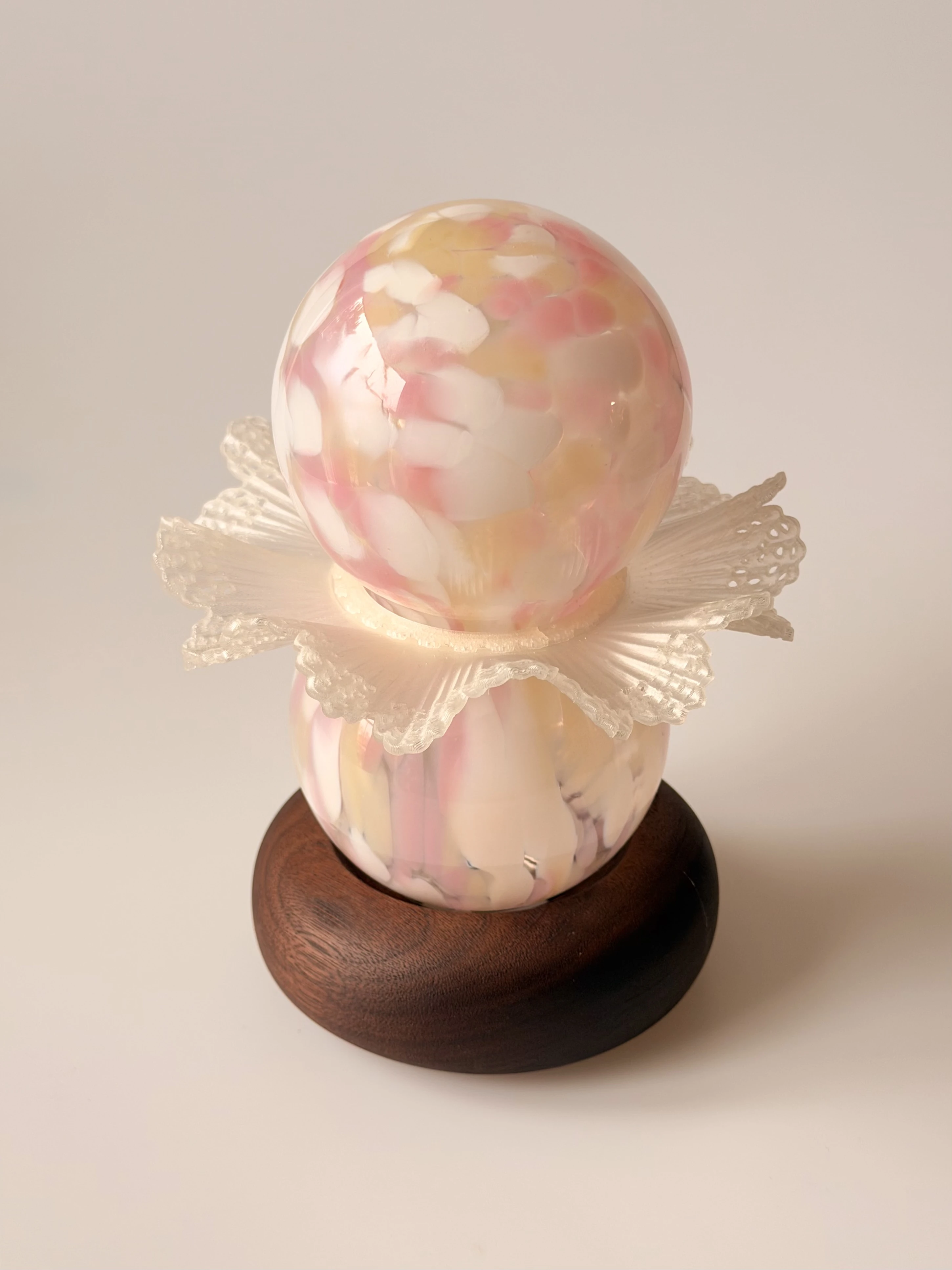 Skontrastowanie pompatycznego, klasycznego rzemiosła ręcznie dmuchanego szkła z nowoczesnym i szczerym drukiem 3D, nawiązuje do akcji opery “Halka” Stanisława Moniuszki. Forma lampki jest poddana antropomorfizacji, dzięki zastosowaniu kulistych kształtów oraz przypominającego kryzę lub halkę falującego detalu.